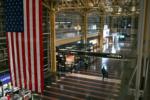 Un passager traverse la zone d'enregistrement de l'aéroport national Ronald Reagan à Washington, D.C., le 24 janvier 2026, après l'annulation de milliers de vols à travers les États-Unis en raison d'une tempête hivernale.